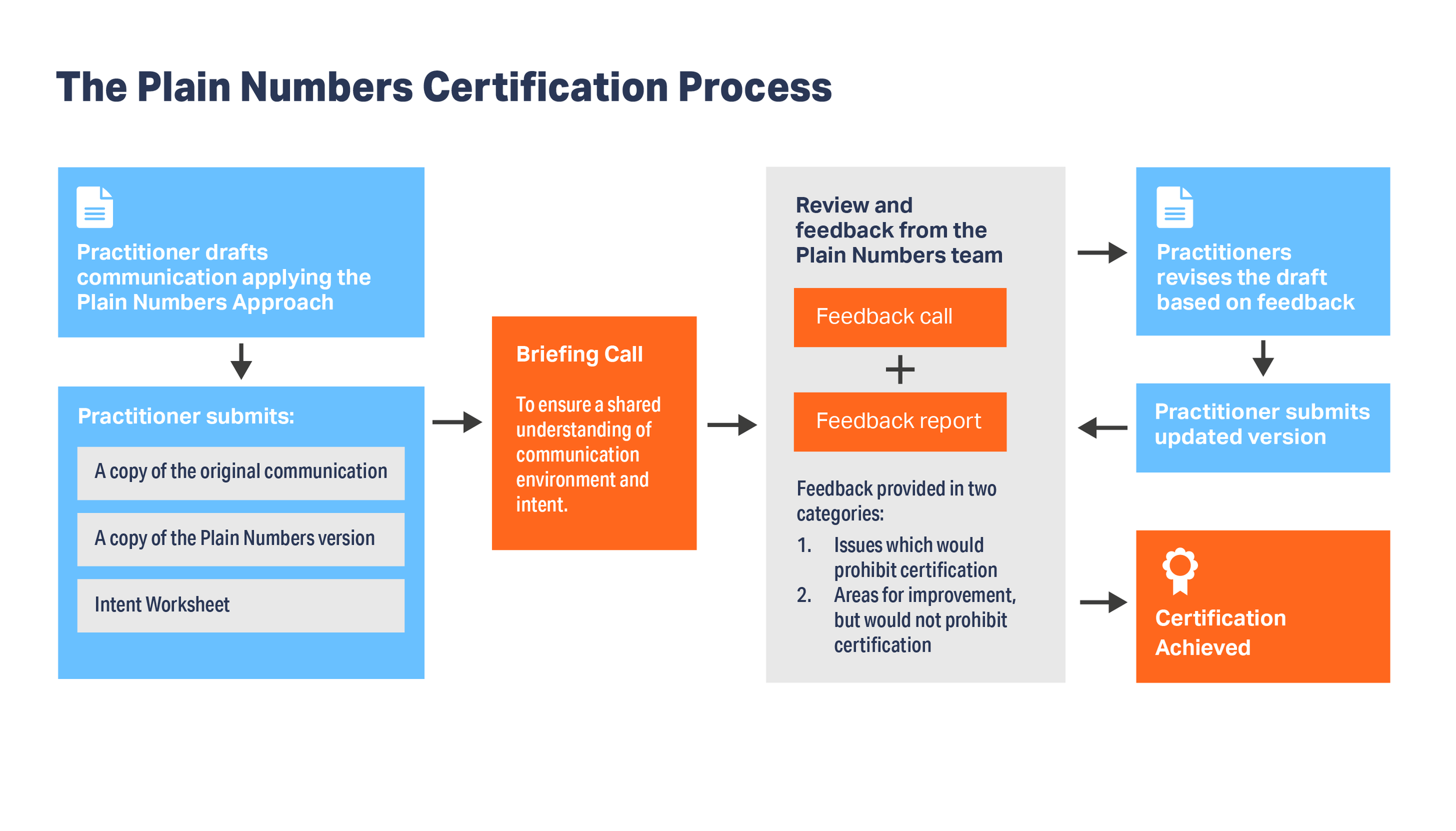 Most organisations have certification credits included in the partnership. This means we work with you to make sure a communication reaches the highest level of clarity from a Plain Numbers perspective. This could be letters, emails, websites or any other form of communication, including videos and customer service scripts.