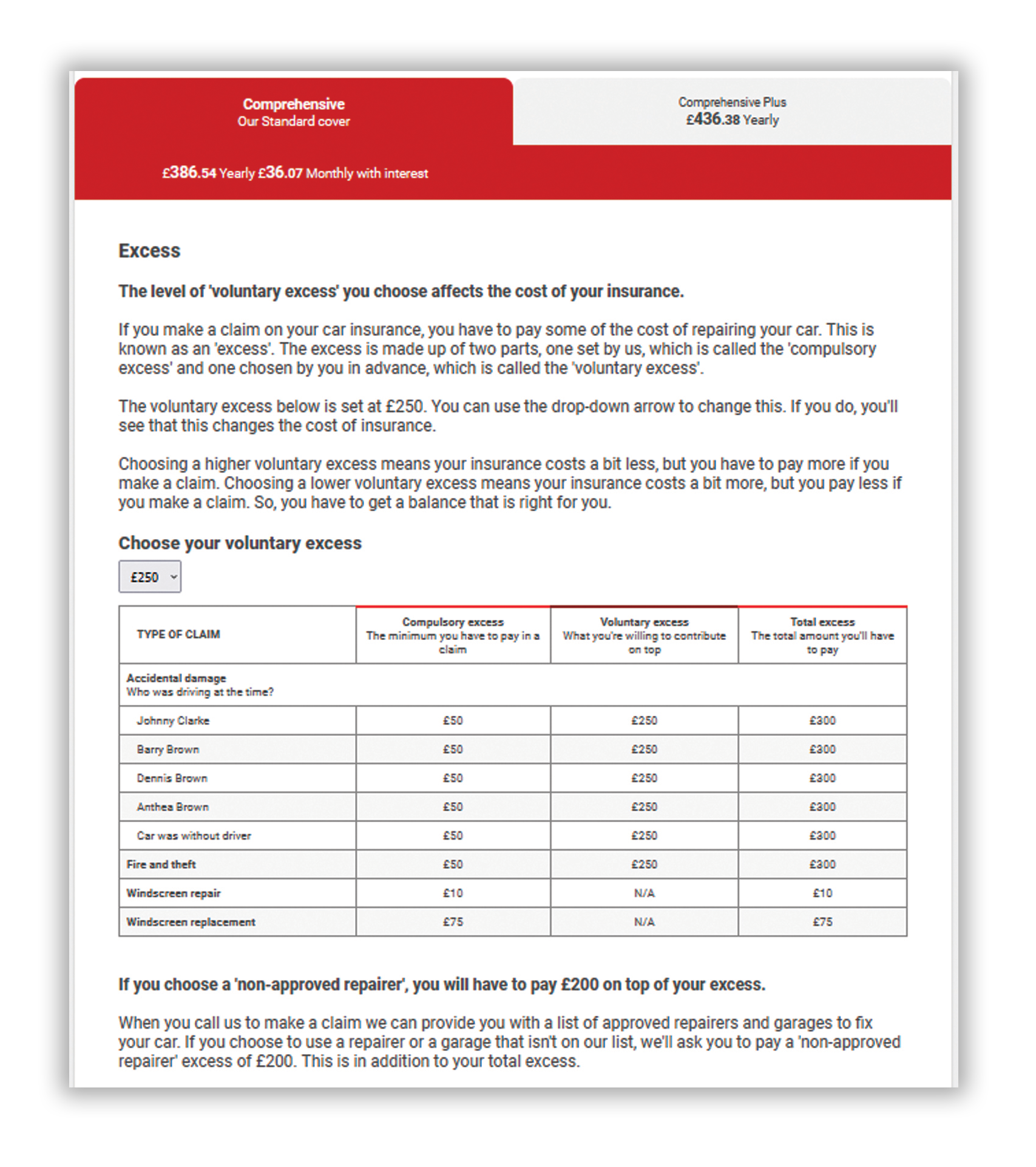 'What is the yearly cost for Comprehensive insurance if you choose a voluntary excess of £500?' and 'If you choose a high voluntary excess, what happens to the cost of your insurance?'